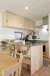 キッチンの位置は変わらないのですが、向きが変わりました。以前はL字型の既製のシステムキッチンでしたが、もくもくはうすの桜井さんの提案でコの字型に変えたことで使い勝手が良くなりました。2人で作業してもスペースがたっぷりあります。桜井さんが最初にいらした時の質問が、「朝起きて、まず何をしますか?」というものだったんです。他社さんは「ご要望は?」という質問だったのでとても意外でしたが、生活スタイルからヒアリングしてプランを考えていただいたんですね。